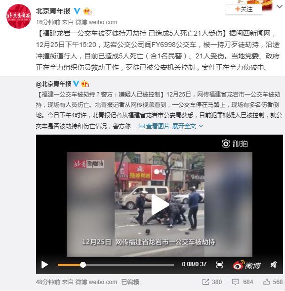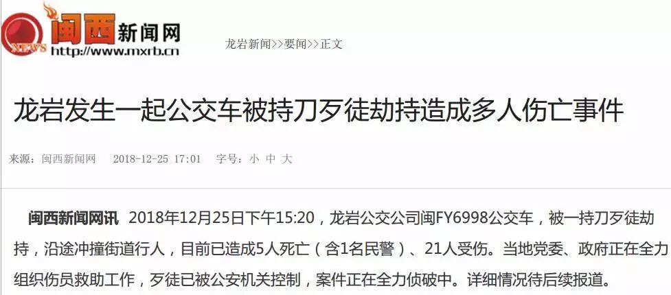 2018年12月25日下午15:20,龙岩公交公司闽FY6998公交车,被一持刀歹徒劫持,沿途冲撞街道行人,目前已造成5人死亡(含1名民警)、21人受伤。