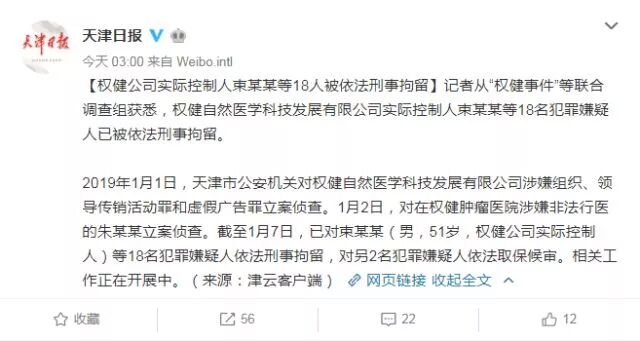 2019年1月1日,天津市公安机关对权健自然医学科技发展有限公司涉嫌组织、领导传销活动罪和虚假广告罪立案侦查。