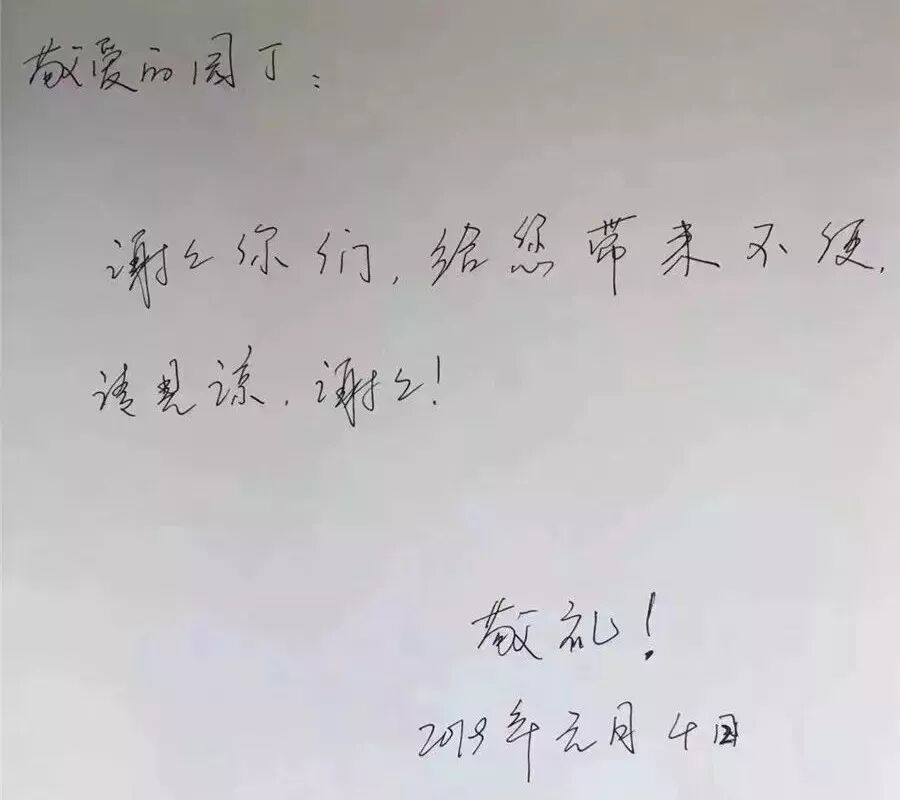 “敬爱的园丁:谢谢你们,给您带来不便,请谅解,谢谢!”
